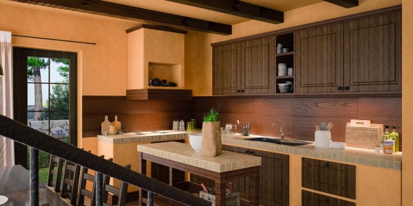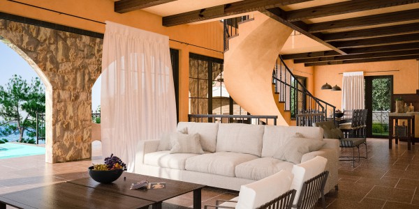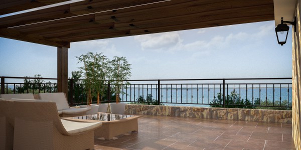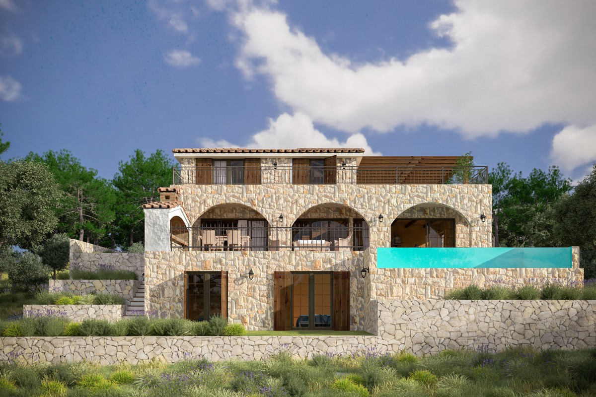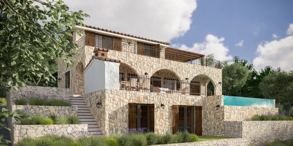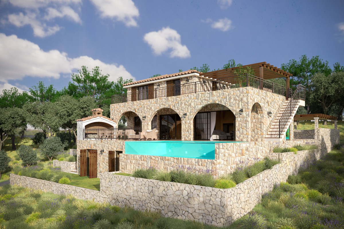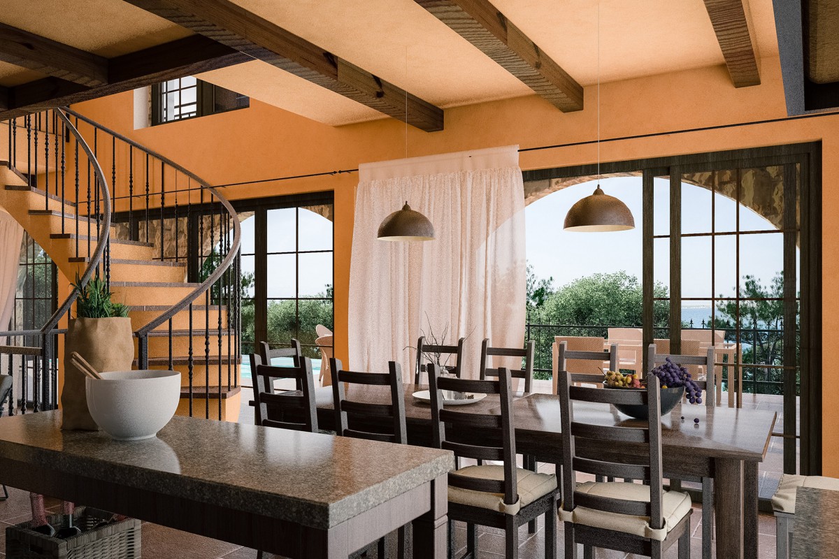 The villa is located on the bay Ljolijnica in Razanj. Razanj is a small picturesque place on the Dalmatian coast far from the majority of tourists. It is captivating because of its unspoiled nature and breathtaking bays. In these beautiful bays, people have built luxury villas where tourists like to spend their summer holidays enjoying the surrounding pine forests, beaches and crystal clear water. You can reach Rogoznica with its world renowned exclusive Marina Frapa in five minutes by boat. The property is well connected. It borders on a paved road. You can visit Primosten, Sibenik, Trogir and Split, all pearls of the Dalmatian coast. These cities are all near by and can fulfil all your entertainment, culture and shopping needs. The property is in the fourth row near the sea and there is a swimming pier and boat docking possibilities. Because of the location, you have an open undisturbed view of the sea to the horizon. The villa faces west and offers spectacular sunset views.
